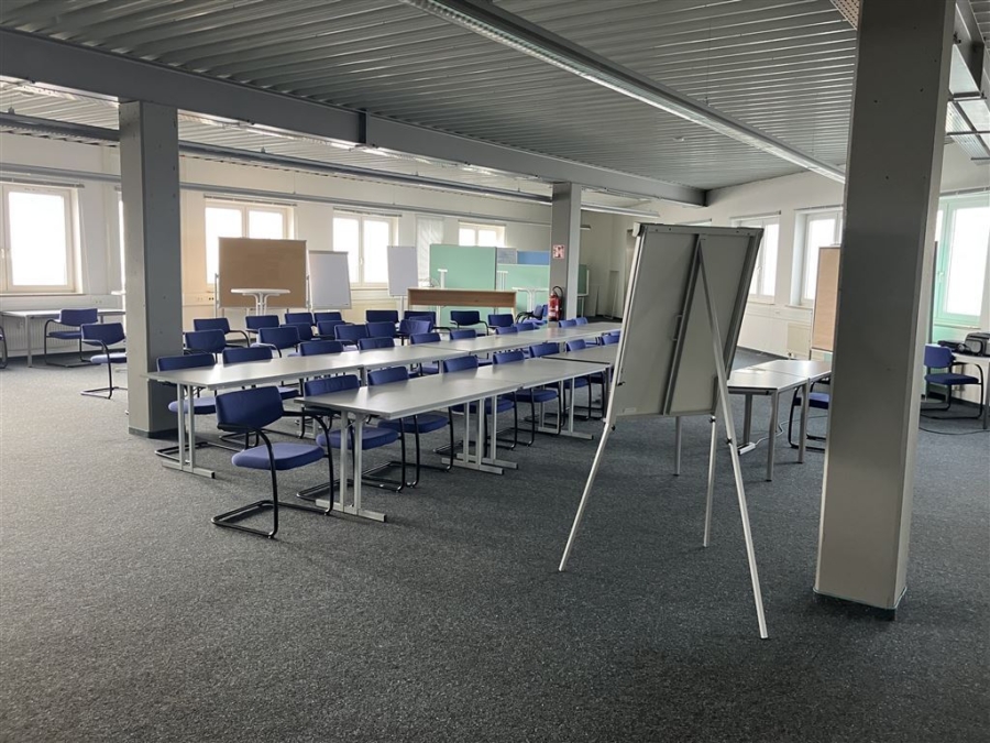 Zur Verfügung stehen ein Aufenthaltsraum mit Küche sowie eine schöne Dachterrasse. Zusätzlich gibt es eine weitere kleine Küche im Großraumbüro; beide Küchen sind ohne Herd und Backofen ausgestattet.